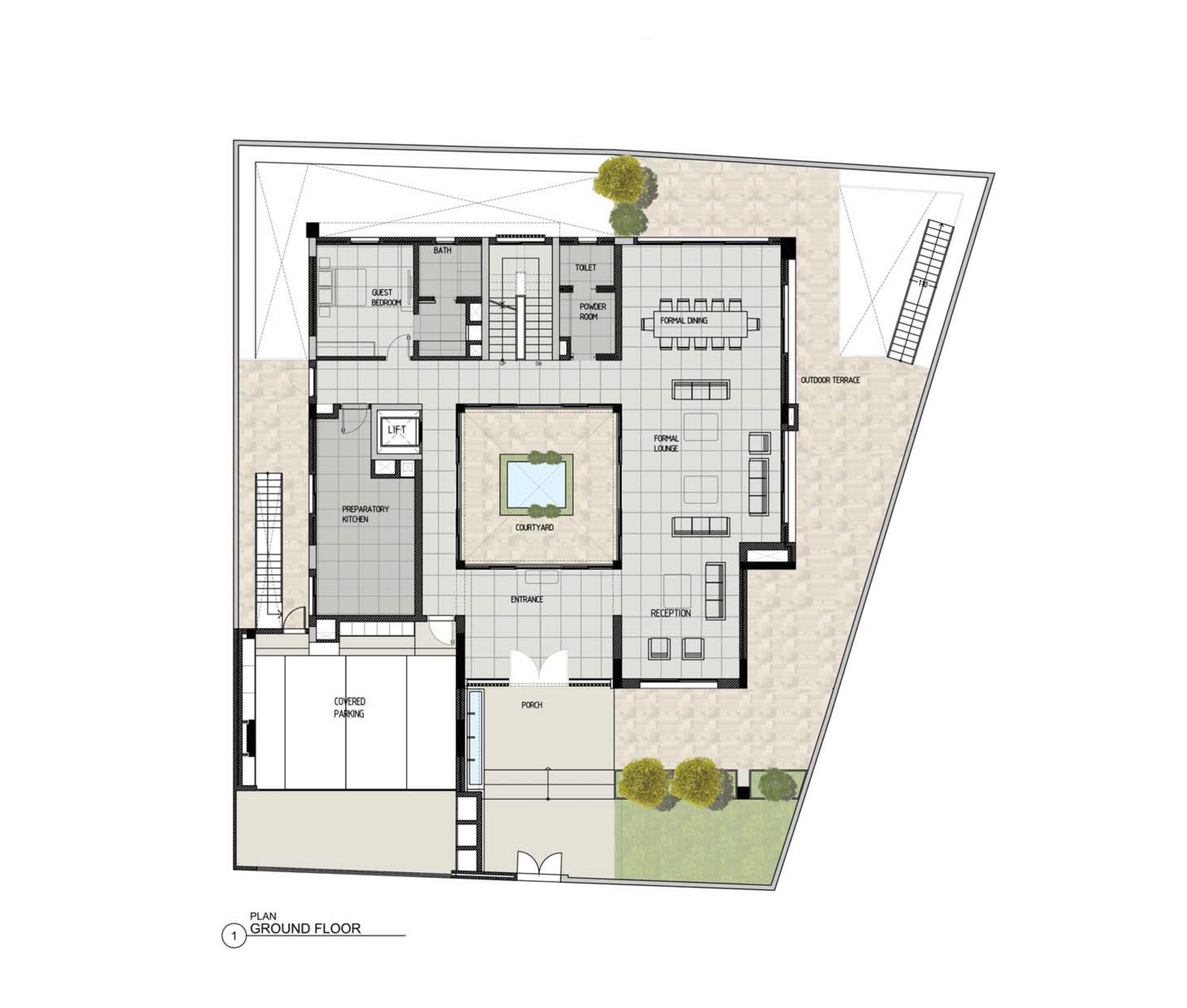 Located in Pearl Dubai, the central feature of this coastal Villa is the Courtyard with a skylight. It is a five-bedroom villa with an open-plan reception area on the ground floor. Services are located in the basement and gardens surround the house. Total Built-up Area: 948 sqm.