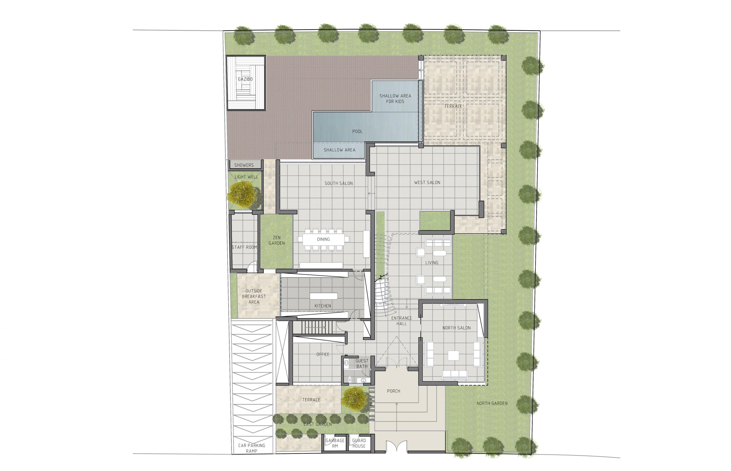 The Project is located in Dubai Hills Development by EMAAR Properties, in the Parkways’ sector. The Project is envisaged to have a lively outdoor existence, while isolated acoustically from the surrounding, a design of interconnectivity of the outdoor and the interior spaces, for usage during mild weather season. The entrances take into consideration the outdoor spaces, the vis-à-vis, and provide an inviting and prestigious entrance to be visible from the road. The villa is targeting a family of three kids; the main kitchen is located in the basement, while a clean kitchen should be located at GF. Bedrooms exposure & orientation to sun, is a key design element, in addition to cooling & shading that allow usage of spaces during the day.